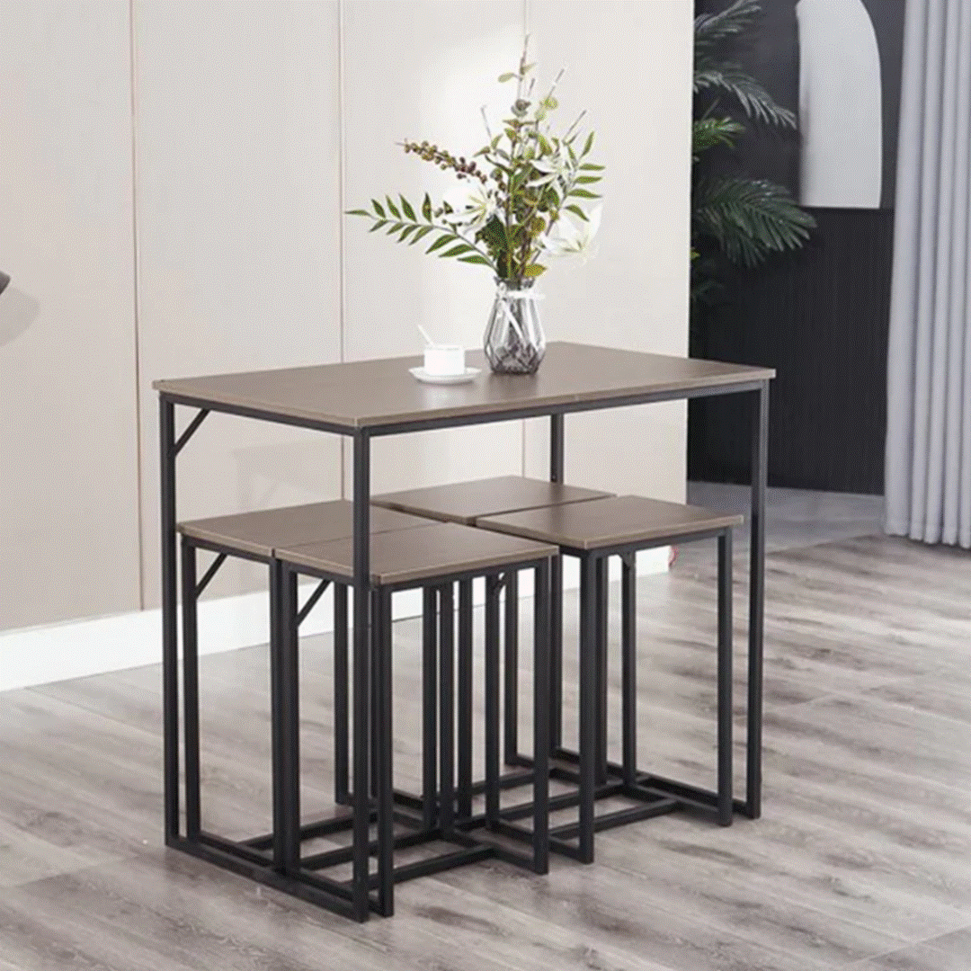الخامات: ستيل - خشب ام دى اف - دهان إلكتروستاتك مقاوم للصدأ والرطوبة مقاس الترابيزة: العرض 110سم - العمق 60سم - الإرتفاع 100سم مقاس الكرسي: العرض40سم - العمق 30سم - الإرتفاع 50سم